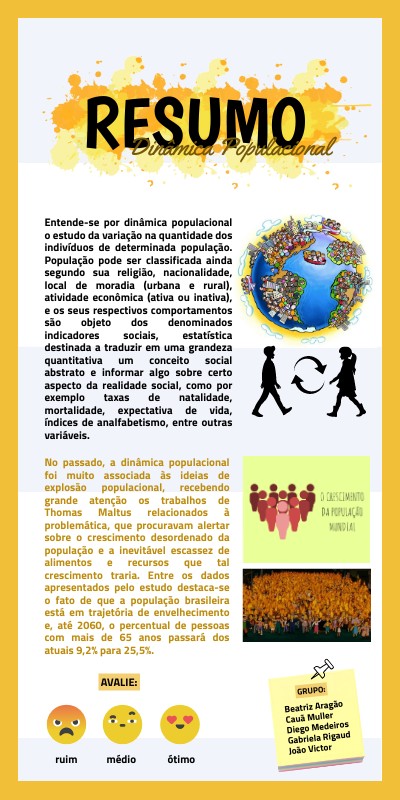 No passado, a dinâmica populacional foi muito associada às ideias de explosão populacional, recebendo grande atenção os trabalhos de Thomas Maltus relacionados à problemática, que procuravam alertar sobre o crescimento desordenado da população e a inevitável escassez de alimentos e recursos que tal crescimento traria. Entre os dados apresentados pelo estudo destaca-se o fato de que a população brasileira está em trajetória de envelhecimento e, até 2060, o percentual de pessoas com mais de 65 anos passará dos atuais 9,2% para 25,5%.