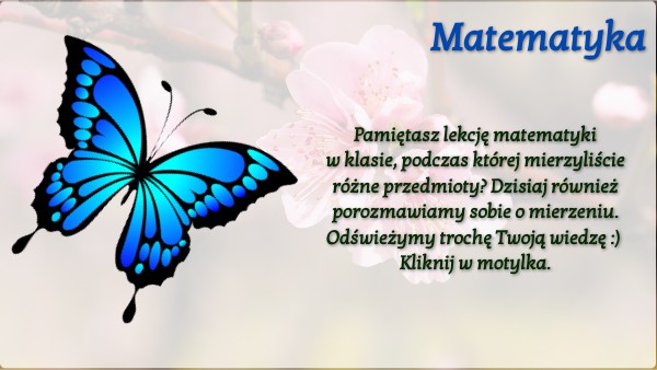 Pamiętasz lekcję matematyki w klasie, podczas której mierzyliście różne przedmioty? Dzisiaj również porozmawiamy sobie o mierzeniu. Odświeżymy trochę Twoją wiedzę :) Kliknij w motylka.