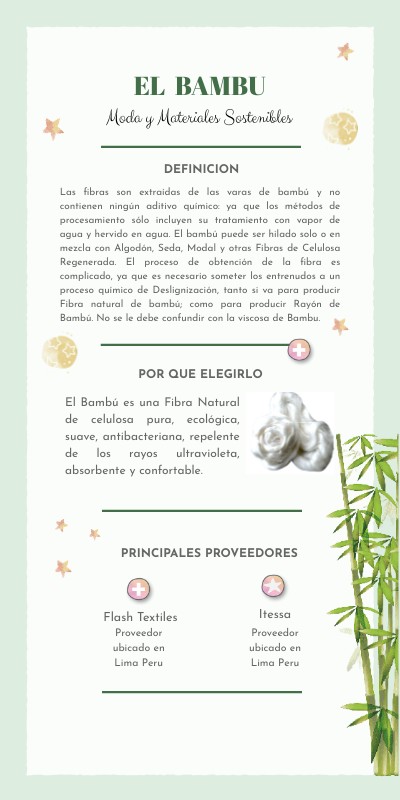 El Bambú es una Fibra Natural de celulosa pura, ecológica, suave, antibacteriana, repelente de los rayos ultravioleta, absorbente y confortable.