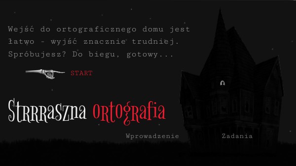 Uczniowie, dzisiaj do ortograficznego strasznego domu wejść nie tylko można, ale trzeba, żeby po pierwsze oswoić straszną ortografię i zwycięsko wyjść z zamku strachów, po drugie co dzień wiedzieć więcej i być mądrzejszym. Waszym zadaniem będzie rozszyfrowanie kilku ortograficznych zagadek i zadań, by bez strachu przemierzyć wszystkie pokoje, błyskawicznie odnaleźć hasła do szyfrów i wydostać się z tego mrocznego miejsca. Pokój zagadek jest odpowiedni dla wszystkich uczniów od klasy czwartej do ósmej. Jeśli Wam się nie uda - na zawsze zostaniecie uwięzieni w ortograficznej niewiedzy. Brrrrr!