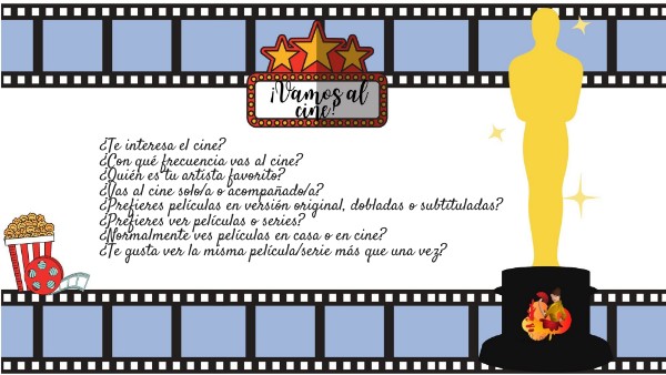 ¿Te interesa el cine?¿Con qué frecuencia vas al cine? ¿Quién es tu artista favorito? ¿Vas al cine solo/a o acompañado/a? ¿Prefieres películas en versión original, dobladas o subtítuladas? ¿Prefieres ver películas o series? ¿Normalmente ves películas en casa o en cine? ¿Te gusta ver la misma película/serie más que una vez?