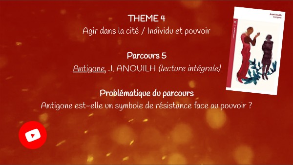 THEME 4Agir dans la cité / Individu et pouvoirParcours 5 Antigone, J. ANOUILH (lecture intégrale) Problématique du parcours Antigone est-elle un symbole de résistance face au pouvoir ?