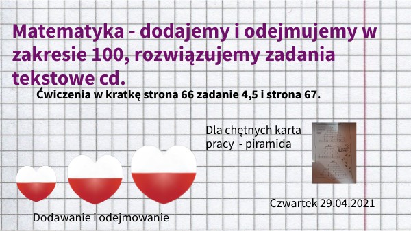 Matematyka - dodajemy i odejmujemy w zakresie 100, rozwiązujemy zadania tekstowe cd.