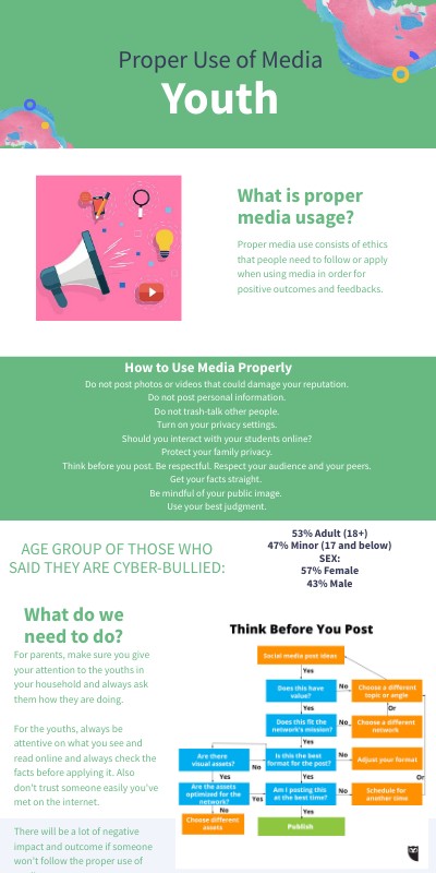For parents, make sure you give your attention to the youths in your household and always ask them how they are doing. For the youths, always be attentive on what you see and read online and always check the facts before applying it. Also don't trust someone easily you've met on the internet. There will be a lot of negative impact and outcome if someone won't follow the proper use of media.