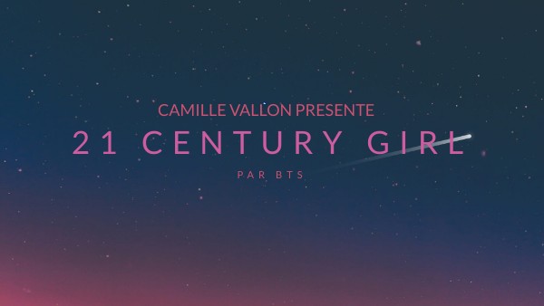 La chanson que j'ai choisie s'appelle 21st Century Girl, du groupe BTS. BTS est un groupe de Kpop créé en 2013 par l'agence HYBE Entertainment (anciennement Big Hit). Il est composé de 7 membres : RM, Jin, Suga, J-Hope, Jimin, V et Jungkook. Le groupe est notamment connu pour son titre à succès "Dynamite" et a déjà gagné un Grammy en 2017. La chanson est sortie en 2016 avec l'album "Wings". C'est une chanson féministe, donc une oeuvre engagée. Elle fut un franc succès auprès des fans de BTS.