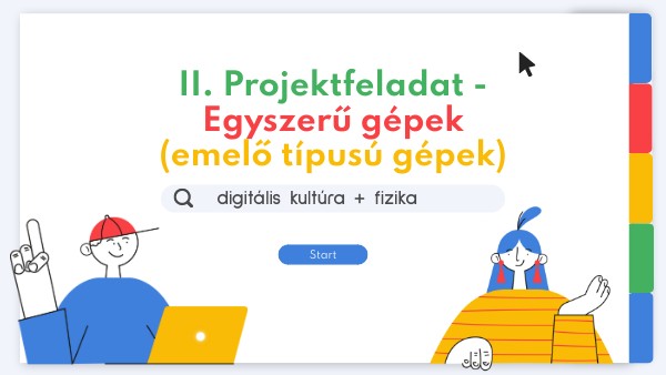 Mutass be egy emelő típusú egyszerű gépet: hogyan működik, milyen részei vannak, miként használjuk, esetleg hogyan készült! Készíts róla videót és egy reklámoldalt is, amivel hirdetni lehet! A videó szólhat a szerkezet használatáról, működéséről, de arról is, hogy hogyan készítettél el saját magad egy emelő típusú gépet.