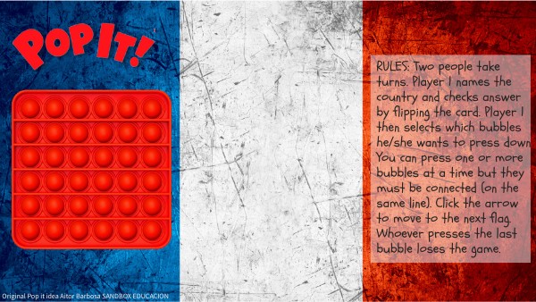 RULES: Two people take turns. Player 1 names the country and checks answer by flipping the card. Player 1 then selects which bubbles he/she wants to press down. You can press one or more bubbles at a time but they must be connected (on the same line). Click the arrow to move to the next flag. Whoever presses the last bubble loses the game.