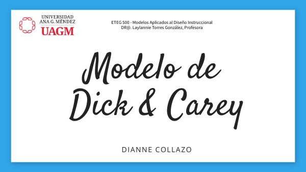 - El Modelo Dick & Carey es un modelo de DI desarrollado por Walter Dick y Lou Carey basado en la idea de que existe una relación predecible y fiable entre un estímulo (material didáctico) y la respuesta que se produce en un alumno.