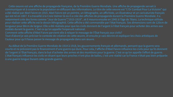 Cette oeuvre est une affiche de propagande française, de la Première Guerre Mondiale. Une affiche de propagande servait à communiquer et à covaincre la population en diffusant des informations. Le titre de cette oeuvre est "L'Or Combat Pour La Victoire" qui a été réalisé par Abel Faivre en 1915. Abel Faivre est un peintre, un lithographe, un affichiste, un illustrateur et un caricaturiste français qui est né en 1867. Il a travaillé à la Croix Valmer là où il a crée des affiches de propagande durant la Première Guerre Mondiale. Il a notamment crée des livres comme "Jour de Guerre","1915-1919"...et il mourra ensuite en 1945 à l'âge de 78ans. La technique utilisée pour réaliser cette affiche est le dessin lithographié. Cette affiche a été commandée par l'état français. Ses dimensions sont de 120cm de longueur pour 80cm de largeur. Elle a été réalisée pour que les civils donnent de l'argent à l'état français pour acheter des armes aux soldats durant la guerre. C'est ce qu'on appelle l'enperunt national. Comment cette affiche d'Abel Faivre parvient-elle à relayer le message de l’État français aux civils? Tout d’abord je vais préciser le contexte de création de cette œuvre, et ensuite je vais décrire et expliquer les choix artistiques de l’auteur pour qu'il fasse passer le message de propagande dans son œuvre. Au début de la Première Guerre Mondiale de 1914 à 1918, les gouvernements français et allemands, pensent que la guerre sera courte et ne prévoient pas le financement d'une guerre qui dure. Pour cela, l'affiche d'Abel Faivre influence les civils pour qu'ils donnent de l’argent à l’État français, dans le but d'acheter des armes et des munitions pour la guerre. C’est ce qu’on appelle l’effort de guerre. L'état français influence les civils en disant que leurs proches n'ont plus de balles, c'est une réalité car la France n’était pas bien préparée à une guerre longue Durant cette grande guerre.