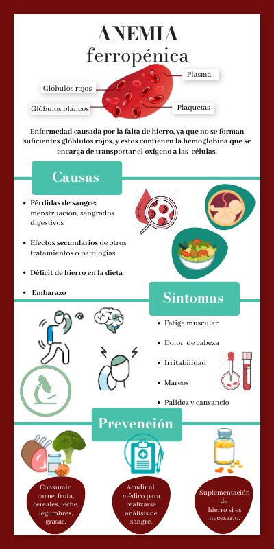 Enfermedad causada por la falta de hierro, ya que no se forman suficientes glóblulos rojos, y estos contienen la hemoglobina que se encarga de transportar el oxígeno a las células.