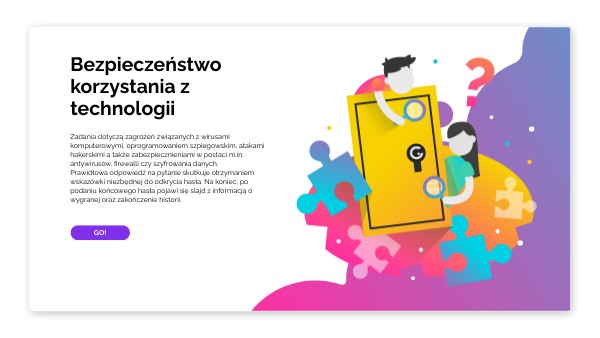 Zadania dotyczą zagrożeń związanych z wirusami komputerowymi, oprogramowaniem szpiegowskim, atakami hakerskimi a także zabezpiecznieniami w postaci m.in. antywirusów, firewalli czy szyfrowania danych. Prawidłowa odpowiedź na pytanie skutkuje otrzymaniem wskazówki niezbędnej do odkrycia hasła. Na koniec, po podaniu końcowego hasła pojawi się slajd z informacją o wygranej oraz zakończenie historii.