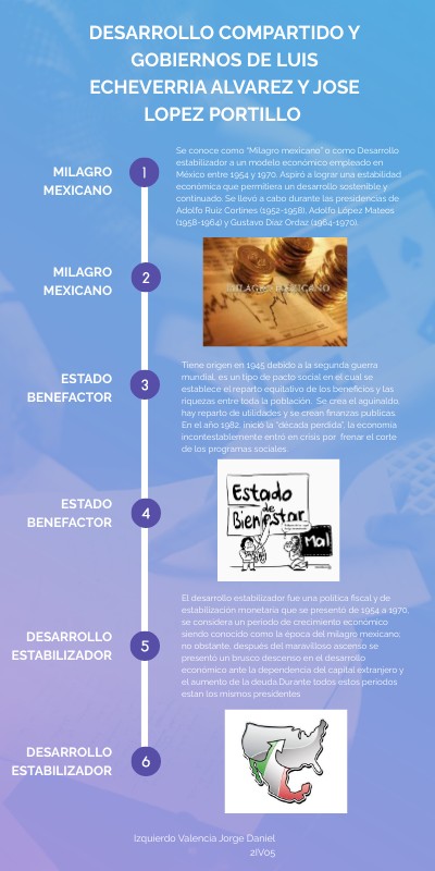 El desarrollo estabilizador fue una política fiscal y de estabilización monetaria que se presentó de 1954 a 1970, se considera un periodo de crecimiento económico siendo conocido como la época del milagro mexicano; no obstante, después del maravilloso ascenso se presentó un brusco descenso en el desarrollo económico ante la dependencia del capital extranjero y el aumento de la deuda.Durante todos estos periodos estan los mismos presidentes