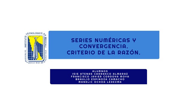 A continuación en esta exposición explicaremos el tema de series numéricas con el criterio de la razón. Mencionaremos como podemos verificar la convergencia de una seria a través del criterio de la razón y explicaremos detalladamente un ejemplo. Daremos a conocer que es como saber despues de obtener el criterio de la razón, como saber si es convergente o divergente.
