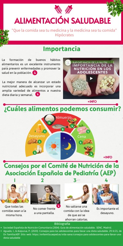 - Aguado, I., & Aizpurua, P.. (2020). Consejos para los adolescentes para llevar una dieta saludable. 29/4/21, de En Familia.AEP. Sitio web: https://enfamilia.aeped.es/vida-sana/consejos-para-adolescentes-para-llevar-una-dieta-saludable