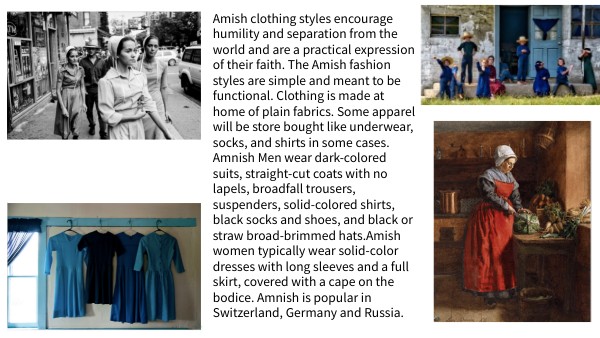 Amish clothing styles encourage humility and separation from the world and are a practical expression of their faith. The Amish fashion styles are simple and meant to be functional. Clothing is made at home of plain fabrics. Some apparel will be store bought like underwear, socks, and shirts in some cases. Amnish Men wear dark-colored suits, straight-cut coats with no lapels, broadfall trousers, suspenders, solid-colored shirts, black socks and shoes, and black or straw broad-brimmed hats.Amish women typically wear solid-color dresses with long sleeves and a full skirt, covered with a cape on the bodice. Amnish is popular in Switzerland, Germany and Russia.