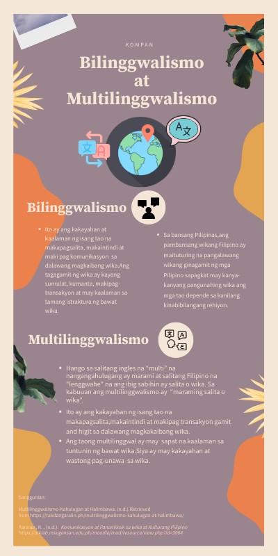 Sanggunian: Multilinggwalismo-Kahulugan at Halimbawa. (n.d.).Retrieved from https://takdangaralin.ph/multilinggwalismo-kahulugan-at-halimbawa/ Parenas, R. , (n.d.). Komunikasyon at Pananliksik sa wika at Kulturang Pilipino https://siklab.msugensan.edu.ph/moodle/mod/resource/view.php?id=3064