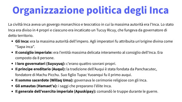 La civiltà Inca aveva un govergo monarchico e teocratico in cui la massima autorità era l'Inca. Lo stato Inca era diviso in 4 propri e ciascuno era incaticato un Tucuy Ricuy, che fungeva da governatore di detto territorio.