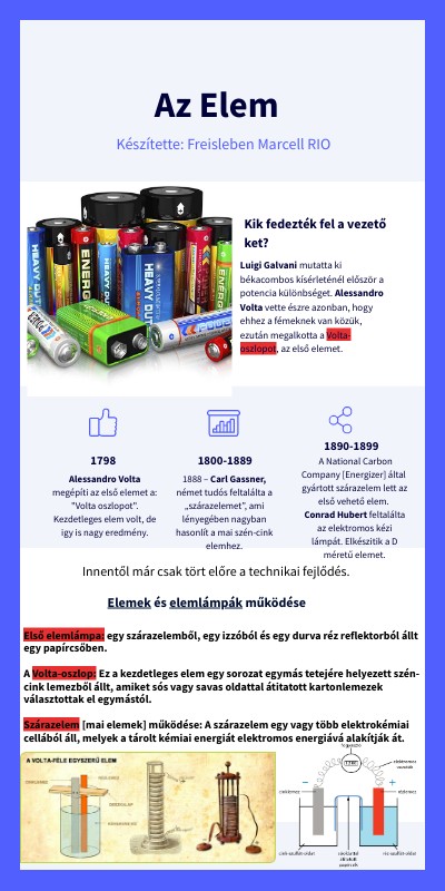 Első elemlámpa: egy szárazelemből, egy izzóból és egy durva réz reflektorból állt egy papírcsőben. A Volta-oszlop: Ez a kezdetleges elem egy sorozat egymás tetejére helyezett szén-cink lemezből állt, amiket sós vagy savas oldattal átitatott kartonlemezek választottak el egymástól. Szárazelem [mai elemek] működése: A szárazelem egy vagy több elektrokémiai cellából áll, melyek a tárolt kémiai energiát elektromos energiává alakítják át.