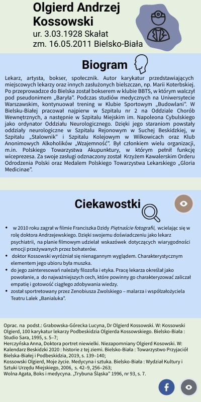 Oprac. na podst.: Grabowska-Górecka Lucyna, Dr Olgierd Kossowski. W: Kossowski Olgierd, 100 karykatur lekarzy Podbeskidzia Olgierda Kossowskiego. Bielsko-Biała : Studio Sara, 1995, s. 5–7;Herczyńska Anna, Doktora portret niewielki. Niezapomniany Olgierd Kosowski. W: Kalendarz Beskidzki 2020 : historie z tej ziemi. Bielsko-Biała : Towarzystwo Przyjaciół Bielska-Białej i Podbeskidzia, 2019, s. 139–140;Kossowski Olgierd, Moje życie. Medycyna i sztuka. Bielsko-Biała : Wydział Kultury i Sztuki Urzędu Miejskiego, 2006, s. 42–9, 256–263; Wolna Agata, Boks i medycyna. „Trybuna Śląska” 1996, nr 93, s. 7.