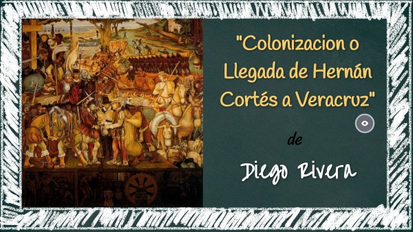 -Título: "Colonizacion o Llegada de Hernán Cortés a Veracruz" -Fecha: 1951 -tamaño: 4,92 m x 5,27 m -Material: Alianzas químicas de pigmentos, agua, arena y cal. -lugar de exposición:Palacio National, Mexico, Mexique-período: Los años 50