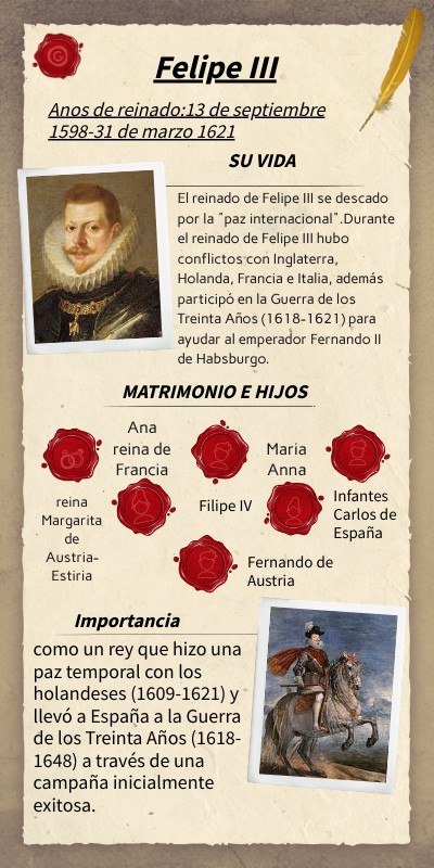 como un rey que hizo una paz temporal con los holandeses (1609-1621) y llevó a España a la Guerra de los Treinta Años (1618-1648) a través de una campaña inicialmente exitosa.