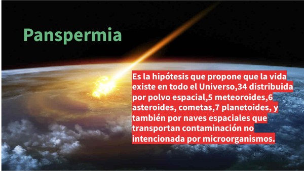 Es la hipótesis que propone que la vida existe en todo el Universo,34 distribuida por polvo espacial,5 meteoroides,6 asteroides, cometas,7 planetoides, y también por naves espaciales que transportan contaminación no intencionada por microorganismos.