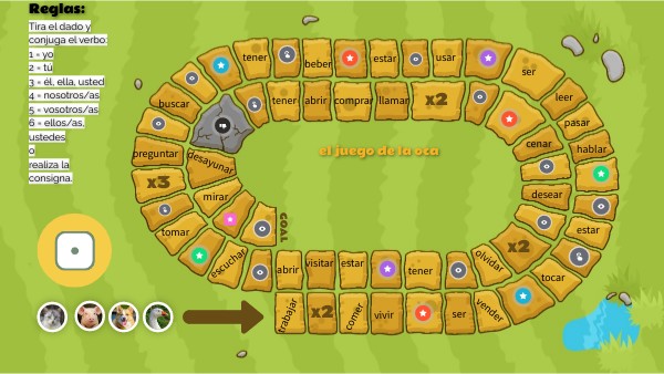 Tira el dado y conjuga el verbo: 1 = yo 2 = tú 3 = él, ella, usted 4 = nosotros/as 5 = vosotros/as 6 = ellos/as, ustedes o realiza la consigna. .