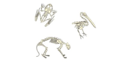 Have a look at the skeletons below and compare them to the human skeleton. Can you recognise the skull, the leg bones and the spine in the pelican, frog and tiger?