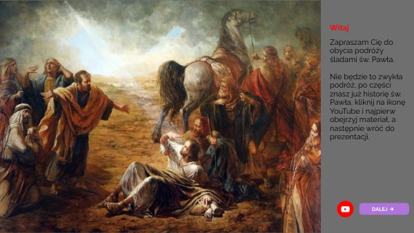 Zapraszam Cię do obycia podróży śladami św. Pawła. Nie będzie to zwykła podróż, po części znasz już historię św. Pawła, kliknij na ikonę YouTube i najpierw obejrzyj materiał, a następnie wróć do prezentacji.