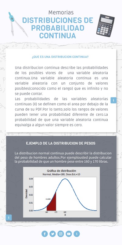 Una distribucion continua describe las probabilidades de los posibles vlores de una variable aleatoria continua.Una variable aleatoria continua es una variable aleatoria con un conjunto de valores posibles(conocido como el rango) que es infinito y no se puede contar.Las probabilidades de las variables aleatorias continuas (X) se definen como el area por debajo de la curva de su PDF.Por lo tanto,solo los rangos de valores pueden tener una probabilidad diferente de cero.La probabilidad de que una variable aleatoria continua equivalga a algun valor siempre es cero.