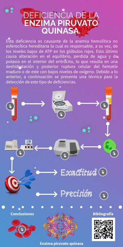 Esta deficiencia es causante de la anemia hemolítica no esferocítica hereditaria la cual es responsable, a su vez, de los niveles bajos de ATP en los glóbulos rojos. Esto último causa alteración en el equilibrio, perdida de agua y de potasio en el interior del eritrocito, lo que resulta en una deshidratación y posterior ruptura celular del hematíe maduro o de este con bajos niveles de oxígeno. Debido a lo anterior, a continuación se presenta una técnica para la detección de este tipo de deficiencias.