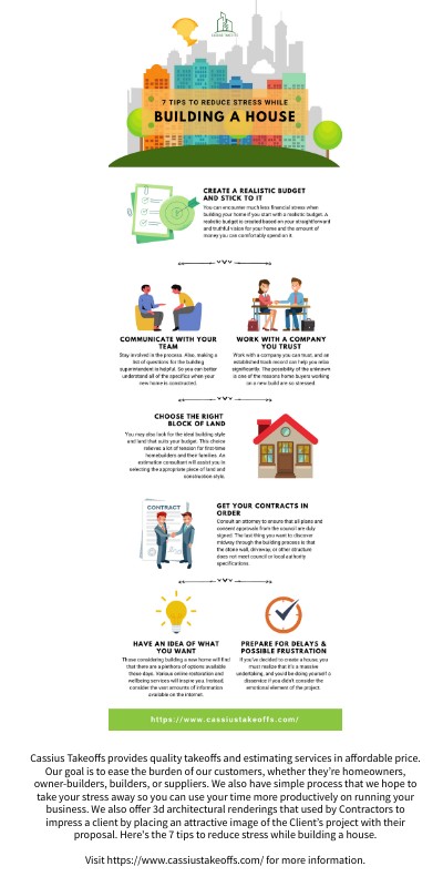 Cassius Takeoffs provides quality takeoffs and estimating services in affordable price. Our goal is to ease the burden of our customers, whether they’re homeowners, owner-builders, builders, or suppliers. We also have simple process that we hope to take your stress away so you can use your time more productively on running your business. We also offer 3d architectural renderings that used by Contractors to impress a client by placing an attractive image of the Client’s project with their proposal. Here's the 7 tips to reduce stress while building a house. Visit https://www.cassiustakeoffs.com/ for more information.
