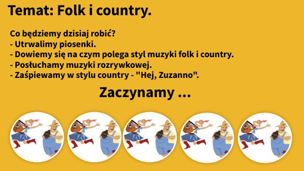 Co będziemy dzisiaj robić? - Utrwalimy piosenki. - Dowiemy się na czym polega styl muzyki folk i country. - Posłuchamy muzyki rozrywkowej. - Zaśpiewamy w stylu country - "Hej, Zuzanno".