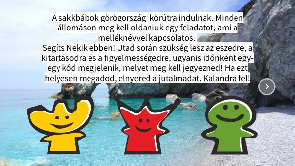 A sakkbábok görögországi körútra indulnak. Minden állomáson meg kell oldaniuk egy feladatot, ami a melléknévvel kapcsolatos. Segíts Nekik ebben! Utad során szükség lesz az eszedre, a kitartásodra és a figyelmességedre, ugyanis időnként egy-egy kód megjelenik, melyet meg kell jegyezned! Ha ezt helyesen megadod, elnyered a jutalmadat. Kalandra fel!