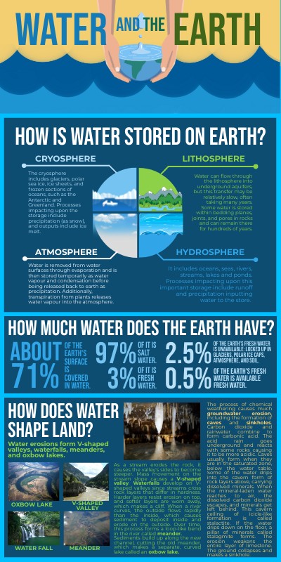 It includes oceans, seas, rivers, streams, lakes and ponds. Processes impacting upon this important storage include runoff and precipitation inputting water to the store.