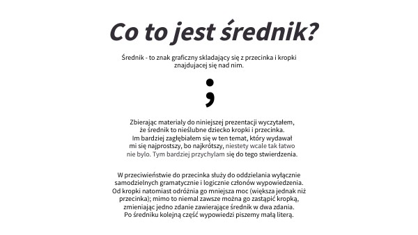 Zbierając materialy do niniejszej prezentacji wyczytałem, że średnik to nieślubne dziecko kropki i przecinka. Im bardziej zagłębiałem się w ten temat, który wydawał mi się najprostszy, bo najkrótszy, niestety wcale tak łatwo nie bylo. Tym bardziej przychylam się do tego stwierdzenia.