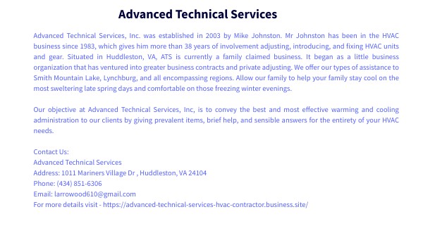 Advanced Technical Services, Inc. was established in 2003 by Mike Johnston. Mr Johnston has been in the HVAC business since 1983, which gives him more than 38 years of involvement adjusting, introducing, and fixing HVAC units and gear. Situated in Huddleston, VA, ATS is currently a family claimed business. It began as a little business organization that has ventured into greater business contracts and private adjusting. We offer our types of assistance to Smith Mountain Lake, Lynchburg, and all encompassing regions. Allow our family to help your family stay cool on the most sweltering late spring days and comfortable on those freezing winter evenings. Our objective at Advanced Technical Services, Inc, is to convey the best and most effective warming and cooling administration to our clients by giving prevalent items, brief help, and sensible answers for the entirety of your HVAC needs. Contact Us: Advanced Technical Services Address: 1011 Mariners Village Dr , Huddleston, VA 24104 Phone: (434) 851-6306 Email: larrowood610@gmail.comFor more details visit - https://advanced-technical-services-hvac-contractor.business.site/
