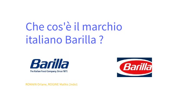 BARILLA è una grande impresa agroindustriale italiana che produce, tra l'altro, pasta (più vendutti, spaghetti, fusili e penne rigate) salse, biscotti, pane e farina. L'impresa è leader mondiale nella pasta secca e leader europeo nei mercati delle salse per pasta e della panetteria preconfezionata. L'attuale presidente : Guido BARILLA , i vicepresidenti : Luca e Paolo BARILLA Slogan che è : "Dove c'è BARILLA, c'è casa" (="Où il y a BARILLA, il y a une maison").