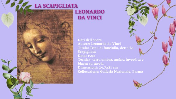 Dati dell'opera Autore: Leonardo da Vinci Titolo: Testa di fanciulla, detta La Scapigliata Data: 1508 Tecnica: terra ombra, ambra inverdita e biacca su tavola Dimensioni: 24,7x21 cm Collocazione: Galleria Nazionale, Parma