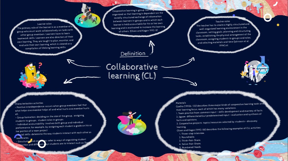 Characterization activities– Positive interdependence: occurs when group members feel that what helps one member helps all and what hurts one member hurts all. – Group formation: deciding on the size of the group, assigning students to groups, student roles in groups. – Individual accountability: involves both group and individual performance, for example, by assigning each student a grade on his or her portion of a team project – Social skills: determine the way students interact with each other as teammates. – Structuring and structures: refer to ways of organizing student interaction and different ways students are to interact such as Three-step