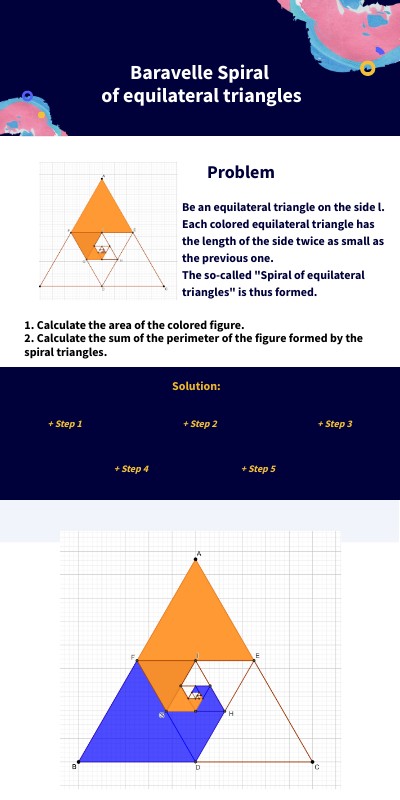Be an equilateral triangle on the side l. Each colored equilateral triangle has the length of the side twice as small as the previous one. The so-called "Spiral of equilateral triangles" is thus formed.