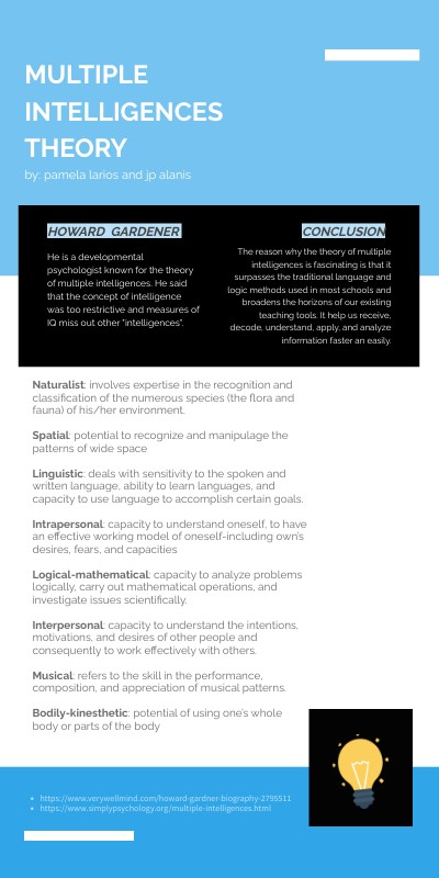 - Marenus, M. (2020, June 09). Gardner's theory of multiple intelligences. Retrieved April 30, 2021, from https://www.simplypsychology.org/multiple-intelligences.html