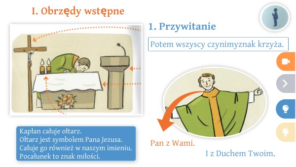 Kapłan całuje ołtarz. Ołtarz jest symbolem Pana Jezusa. Całuje go również w naszym imieniu. Pocałunek to znak miłości.