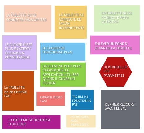 1- Regarde moins dans le blanc des yeux et jure moi que tu as bien branché ta tablette et que tu n'essayes pas d'éviter un mot. 2: L'élève a t-il le chargeur d'origine ? S'il utilise son chargeur de portable, il faut laisser charger toute la nuit car la charge est plus longue. 3- Combien de temps la tablette a chargé ? Une heure ca ne suffit pas. Pour être tranquille conseiller de la charger toute la nuit. 4- L'élève a t-il bien vérifier que sa tablette était en charge ? Voyant luminueux en haut à gauche, et pile avec un éclair qui apparait sur l'écran ? 5- Demander à l'élève de faire un autre essai en changeant de prise et si ca recommence de rapporter son chargeur et son fil de batterie 6-essayer de charger sa tablette avec son fil de batterie et son chargeur. Si ca ne marche pas, changer le fil, puis changer le chargeur pour identifier le problème. 7- si ca ne charge toujours pas, SAV. Si ca charge dire à l'élève qu'il doit racheter un chargeur, 10,60 EUROS avec Noémie.ou dans le commerce
