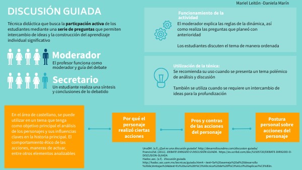 Hadoc.azc. (s.f). Discusión guiada. http://hadoc.azc.uam.mx/tecnicas/guiada.htm#:~:text=Se%20asemeja%20al%20desarrollo %20de,Ventajas%3A&text=Es%20una%20t%C3%A9cnica%20de%20f%C3%A1cil%20aplicaci%C3%B3n.