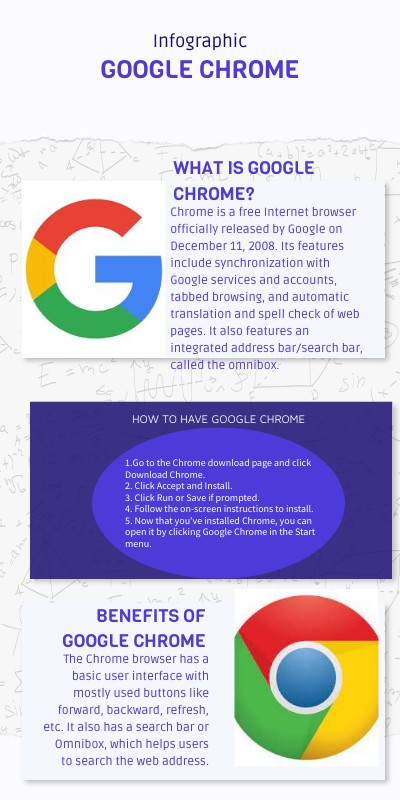 Chrome is a free Internet browser officially released by Google on December 11, 2008. Its features include synchronization with Google services and accounts, tabbed browsing, and automatic translation and spell check of web pages. It also features an integrated address bar/search bar, called the omnibox.