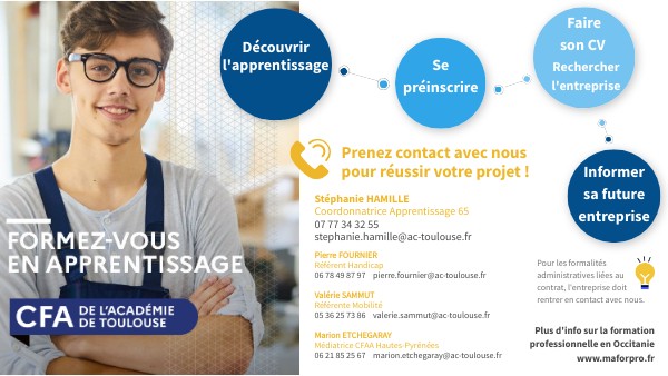Pierre FOURNIERRéférent Handicap 06 78 49 87 97 pierre.fournier@ac-toulouse.fr Valérie SAMMUT Référente Mobilité 05 36 25 73 86 valerie.sammut@ac-toulouse.fr Marion ETCHEGARAY Médiatrice CFAA Hautes-Pyrénées 06 21 85 25 67 marion.etchegaray@ac-toulouse.fr