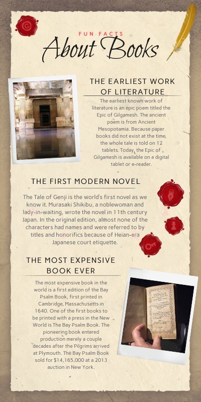The earliest known work of literature is an epic poem titled the Epic of Gilgamesh. The ancient poem is from Ancient Mesopotamia. Because paper books did not exist at the time, the whole tale is told on 12 tablets. Today, the Epic of Gilgamesh is available on a digital tablet or e-reader.