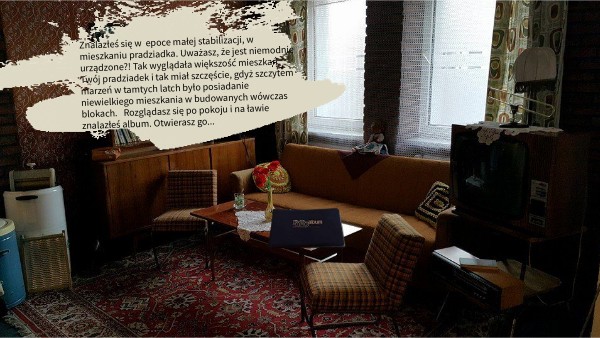 Znalazłeś się w epoce małej stabilizacji, w mieszkaniu pradziadka. Uważasz, że jest niemodnie urządzone?! Tak wyglądała większość mieszkań. Twój pradziadek i tak miał szczęście, gdyż szczytem marzeń w tamtych latch było posiadanie niewielkiego mieszkania w budowanych wówczas blokach. Rozglądasz się po pokoju i na ławie znalazłeś album. Otwierasz go...
