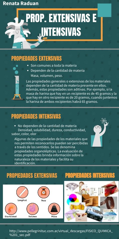 Las propiedades generales o extensivas de los materiales dependen de la cantidad de materia presente en ellos. Además, estas propiedades son aditivas. Por ejemplo, si la masa de harina que hay en un recipiente es de 45 gramos y la que hay en otro recipiente es de 20 gramos, cuando juntemos la harina de ambos recipientes habrá 65 gramos.